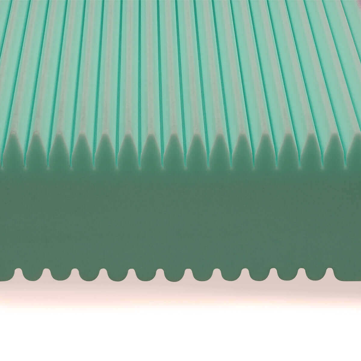 The pelvic zone of the QUQON TrioBalance mattress is no accident, but precision in foam form. Its unique pyramid cut reacts intelligently to your body: as you sink deeper, the small foam pyramids widen â and thus become more supportive. This allows your body to automatically find the perfect pressure point for maximum relief and ergonomically correct sleep. Tailored to your pelvic width and body weight.