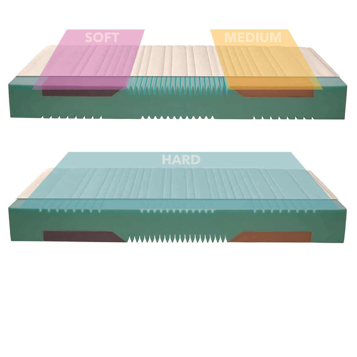 This side of the mattress provides a consistently supportive sleeping surface with a clearly defined 5-zone cut . The firm, continuous foam offers noticeable stability and ergonomic spinal alignment â ââwithout any sinking in at the shoulders . Ideal for back sleepers, stomach sleepers, or anyone who prefers a more compact, firmer feel without sacrificing balanced pressure distribution.