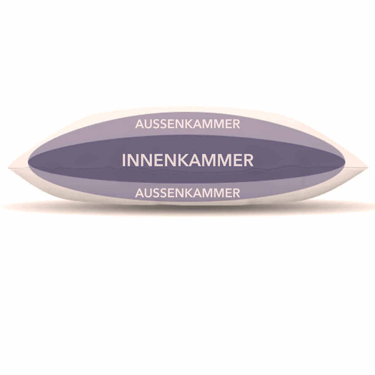 Les deux compartiments extérieurs sont remplis de duvet fin à 100 % pour un confort optimal. Le compartiment intérieur contient des plumes finement triées pour un soutien ergonomique qui soulage la pression sur les cervicales. Ainsi, aucune plume ne risque de gêner le matelas.