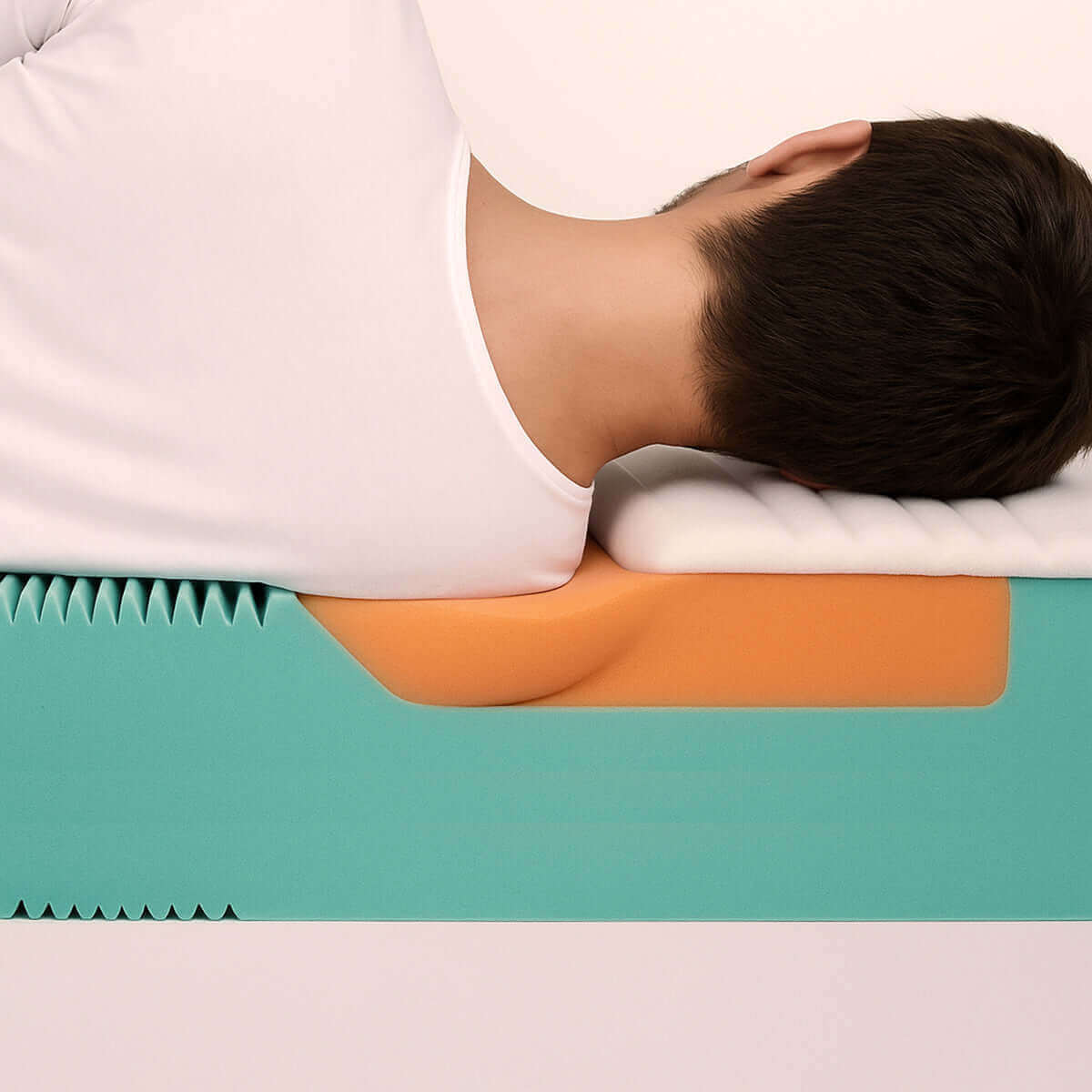 Cette zone offre un équilibre parfait entre soulagement de la pression et stabilité. La mousse souple mi-ferme et hautement élastique permet à l'épaule de s'enfoncer délicatement sans compromettre le soutien – idéal pour ceux qui préfèrent un soutien ferme tout en privilégiant un soulagement ergonomique de la pression. Parfait pour les personnes dormant sur le dos, sur le côté ou dans différentes positions, et ayant un poids normal à plus élevé, qui recherchent un soutien harmonieux au niveau des épaules.