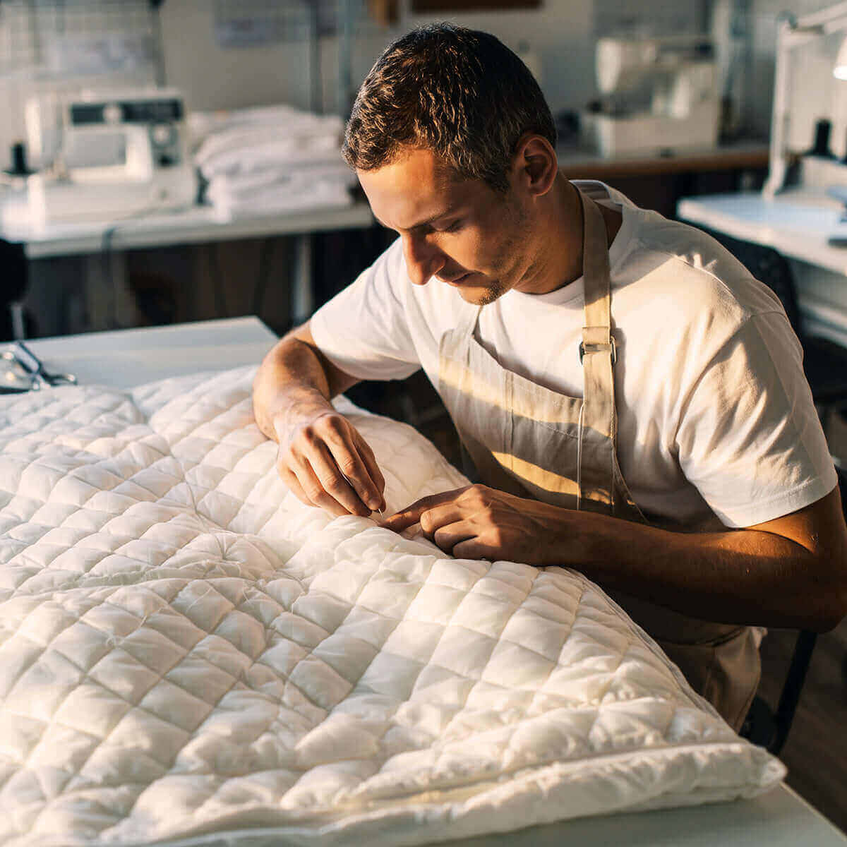 Jedes QUQON Eiderdaunenkissen wird in norddeutscher Handwerksqualität gefertigt – von Menschen, die ihr Handwerk verstehen und wissen, was guten Schlaf wirklich ausmacht.