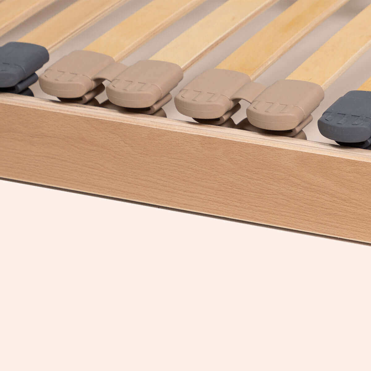 Alle beweglichen Elemente sind gedämpft, und die Rahmenecken sind vollständig mit Kunststoffschonern ummantelt. Dadurch bleibt der Lattenrost auch bei nächtlichen Bewegungen angenehm leise und sorgt für störungsfreien, ruhigen Schlaf.