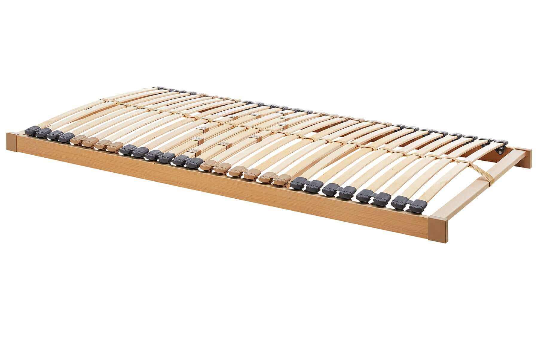 28 Holzfederlatten aus unbehandeltem Hartholz, die paarweise über dem Rahmen in elastischen Kunststofffedern gelagert sind, eigene Schulterzone und stufenlos verstellbare Beckenzone, stabilisierender Mittelgurt aus Baumwolle, metallfrei